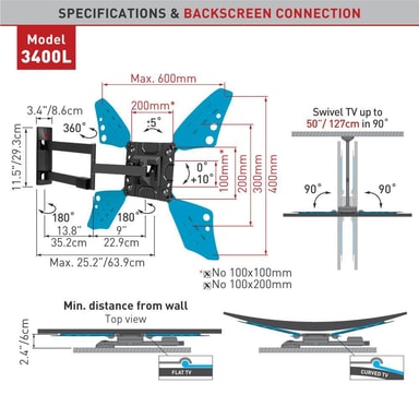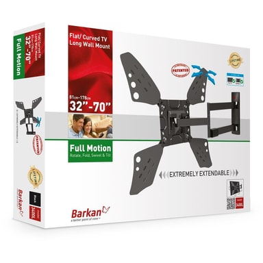 Andra funktioner: Extremt utdragbar i öppet läge för att möjliggöra visning från en mängd olika platser och placera skärmen runt hörnet av en vägg. • Inkluderar en patenterad mekanism för att passa både platta och krökta skärmar.