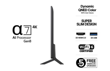 Drivs av α7 AI-processorn förbättrar LG QNED varje bildruta intelligent med skarpare detaljer, rikare färger och klarare ljud. Den analyserar ditt innehåll i realtid och optimerar upplevelsen för streaming, gaming och live-TV. Smart prestanda – alltid på topp.