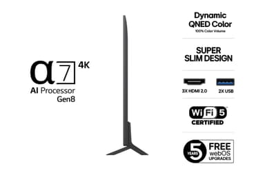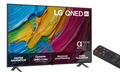 LG QNED 80 kombinerar α7 AI Processor 4K Gen8 och QNED evo Colour för livfulla färger och stark kontrast. HDR10 Pro och Local Dimming förbättrar bilden, medan den 29 mm tunna designen med flexibelt stativ gör att den passar perfekt i alla rum.Läs mer om produkten