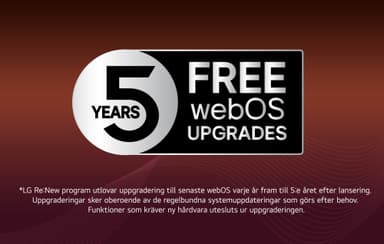 webOS re:new håller din TV uppdaterad fem år från lanseringen. Årliga fullständiga systemuppdateringar ger dig inte bara den senaste versionen av webOS utan dessutom alla de kommande funktionerna! Efter fem år har du fortfarande de app- och systemuppdateringar du behöver och din TV kommer att vara redo för många fler år!