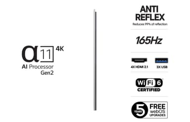 OLED G5 är perfekt för gamers eftersom den har stöd för 165 Hz G-Sync och FreeSync som eliminerar lagg och ger supersmidiga rörelser. Med LG:s Game Optimizer och Dashboard, kan du finjustera inställningarna i realtid för att få bästa prestanda. Supersnabb svarstid på 0,1 ms och lågt input-lagg ger dig en stor fördel, samtidigt som fantastisk OLED-grafik får dig att leva dig in i spelet.