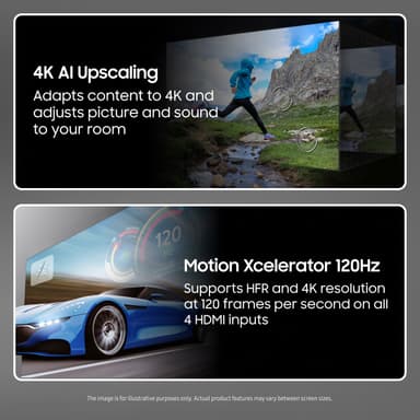 *Utbudet av appar och tjänster varierar över tid, då gamla kan upphöra och nya tillkomma. Vissa appar och tjänster kräver abonnemang eller engångsköp för att kunna användas. Samsung kan visa reklam och kampanjer på Smart TV-gränssnittet och applikationer. Skärmspegling fungerar endast när TV och mobil är påslagna och anslutna till samma WiFi-nätverk. Apple och AirPlay är varumärken som tillhör Apple Inc., registrerade i USA och andra länder/regioner. AirPlay kräver iOS 12.3 eller senare eller macOS 10.14.5 eller senare.