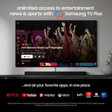 • Kostnadsfri tillgång till film, serier, sport och nyheter med Samsung TV Plus.