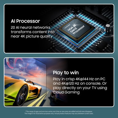 NQ4 AI Gen2 Processor Upplev toppen av bildkvalitet med NQ4 AI Gen2-processorn. Den AI-drivna processorn uppskalar inte bara innehållet till enastående 4K-upplösning utan optimerar också bilden och ljudet för din miljö. Dessutom förstärker Real Depth-förstärkaren kontrasten i förgrunden, vilket ger dig en förbättrad känsla av djup och realism.