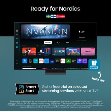 *Gäller vid köp av utvalda modeller av projektorer och utvalda 2024 års Samsung TV på samsung.com och hos utvalda återförsäljare under perioden 2024-04-29 – 2025-03-31. Begränsningar förekommer och streamingtjänsterbjudanden som ingår kan variera under kampanjen. Kräver ett Samsung-konto samt att kund skapar konto hos aktuell streamingtjänst. Villkor: samsung.com/se/smartstart