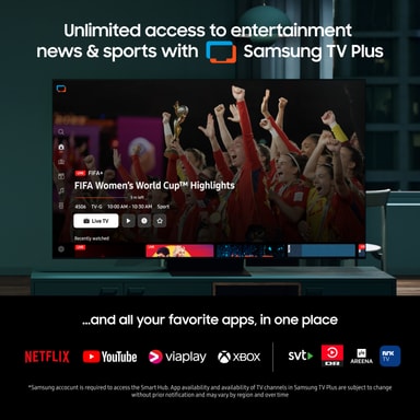 • Kostnadsfri tillgång till film, serier, sport och nyheter med Samsung TV Plus.