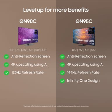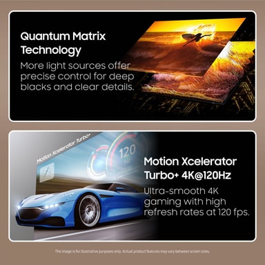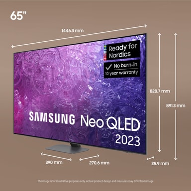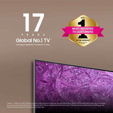 1 Källa – Omdia, jan 2023. Resultaten är inte ett marknadsföringsbudskap från Samsung. Eventuella hänvisningar till dessa resultat sker på egen risk av tredje part. 2 Enligt en undersökning utförd av Kantar Sifo genomförd i januari 2023 är 93 % nöjda med sin Samsung TV. Resultaten är inte ett marknadsföringsbudskap från Samsung. Eventuella hänvisningar till dessa resultat sker på egen risk av tredje part. 3 Gäller vid köp av utvalda modeller av projektorer och utvalda 2023 års Samsung TV på samsung.com och hos utvalda återförsäljare under perioden 2023-04-20 – 2023-12-31. Begränsningar förekommer och streamingtjänsterbjudanden som ingår kan variera under kampanjen. Kräver att kund skapar konto hos aktuell streamingtjänst. Samsung kan visa reklam och kampanjer på Smart TV-gränssnittet och applikationer. Tillgänglighet av appar kan variera över tid och region. Villkor: samsung.com/se/tvs/smart-tv/smart-start. 4 Garantin gäller i 10 år från inköpsdatumet. Kräver en kopia av inköpskvittot och registreringen på Samsungs webbplats inom 90 dagar efter köpet. Gäller för köp av utvalda 2023 TV-modeller mellan 20.04.2023 – 31.03.2024. Se villkor på: