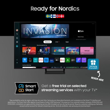 *Gäller vid köp av utvalda modeller av projektorer och utvalda 2024 års Samsung TV på samsung.com och hos utvalda återförsäljare under perioden 2024-04-29 – 2025-03-31. Begränsningar förekommer och streamingtjänsterbjudanden som ingår kan variera under kampanjen. Kräver ett Samsung-konto samt att kund skapar konto hos aktuell streamingtjänst. Villkor: samsung.com/se/smartstart