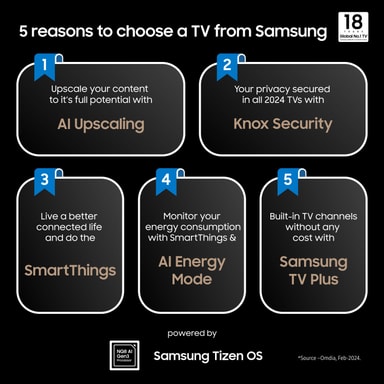 *Gäller vid köp av utvalda 2024 Samsung TV hos utvalda återförsäljare. Garantin är giltig i 10 år från köpdatum. Kräver en kopia på inköpskvitto samt registrering på Samsungs hemsida inom 90 dagar efter köp. Gäller köp av utvalda 2024 års TV-modeller till och med 31 Mars 2025. www.samsung.com/se/offer/offline/screen-burn-warranty