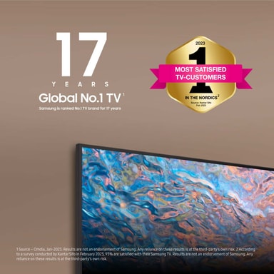 1 Källa – Omdia, jan 2023. Resultaten är inte ett marknadsföringsbudskap från Samsung. Eventuella hänvisningar till dessa resultat sker på egen risk av tredje part. 2 Enligt en undersökning utförd av Kantar Sifo genomförd i januari 2023 är 93 % nöjda med sin Samsung TV. Resultaten är inte ett marknadsföringsbudskap från Samsung. Eventuella hänvisningar till dessa resultat sker på egen risk av tredje part. 3 Gäller vid köp av utvalda modeller av projektorer och utvalda 2023 års Samsung TV på samsung.com och hos utvalda återförsäljare under perioden 2023-04-20 – 2023-12-31. Begränsningar förekommer och streamingtjänsterbjudanden som ingår kan variera under kampanjen. Kräver att kund skapar konto hos aktuell streamingtjänst. Samsung kan visa reklam och kampanjer på Smart TV-gränssnittet och applikationer. Tillgänglighet av appar kan variera över tid och region. Villkor: samsung.com/se/tvs/smart-tv/smart-start. 4 Garantin gäller i 10 år från inköpsdatumet. Kräver en kopia av inköpskvittot och registreringen på Samsungs webbplats inom 90 dagar efter köpet. Gäller för köp av utvalda 2023 TV-modeller mellan 20.04.2023 – 31.03.2024. Se villkor på: