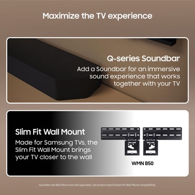 *Utbudet av appar och tjänster varierar över tid, då gamla kan upphöra och nya tillkomma. Vissa appar och tjänster kräver abonnemang eller engångsköp för att kunna användas. Samsung kan visa reklam och kampanjer på Smart TV-gränssnittet och applikationer. Skärmspegling fungerar endast när TV och mobil är påslagna och anslutna till samma WiFi-nätverk. Apple och AirPlay är varumärken som tillhör Apple Inc., registrerade i USA och andra länder/regioner. AirPlay kräver iOS 12.3 eller senare eller macOS 10.14.5 eller senare.