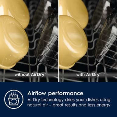 Den nya AirDry-tekniken använder naturligt luftflöde för att slutföra torkning, vilket ger upp till tre gånger bättre prestanda jämfört med systemet med stängd lucka. Luckan öppnas 10 cm mot slutet av programmet, luften cirkulerar och ger utmärkt torkresultat.