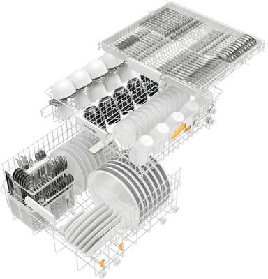 Mycket bekvämt: Mieles besticklåda i original rengör besticken grundligt och skonsamt. Det finns även en bestickkorg. Den höjdjusterbara överkorgen och MultiComfort-området i underkorgen gör placeringen av disken flexibel så att allt får plats.