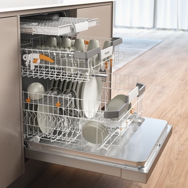 Mieles diskmaskiner har plats för upp till 14 standardkuvert. Förutom att vi följer gällande normer ser vi även till att dina behov och önskemål uppfylls så att allt diskgods inte bara kan placeras optimalt, utan även blir rent och torrt.