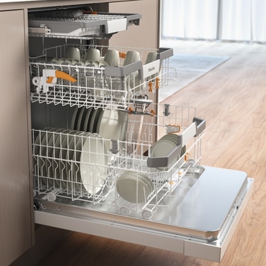 Mieles diskmaskiner har plats för upp till 14 standardkuvert. Förutom att vi följer gällande normer ser vi även till att dina behov och önskemål uppfylls så att allt diskgods inte bara kan placeras optimalt, utan även blir rent och torrt.