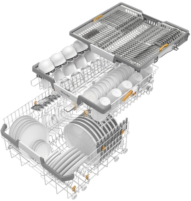 Mieles diskmaskiner har plats för upp till 14 standardkuvert. Förutom att vi följer gällande normer ser vi även till att dina behov och önskemål uppfylls så att allt diskgods inte bara kan placeras optimalt, utan även blir rent och torrt.