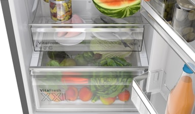 *Användningen av CO₂-reducerat stål (specialbearbetat stål), skum och plast vid tillverkningen av specifika Bosch-kylskåp (standardstorlek: KGN39VXAT, XL-storlek: KGN492IAF) verifieras genom massbalanseringsberäkningar i enlighet med ISO 22095. Under tillverkningen blandas dessa material delvis med konventionella material, men deras certifierade egenskaper tilldelas Bosch-kylskåp genom denna metod. Produktionsmaterialens egenskaper (exklusive förpackning) bedöms enligt ISO 14067.