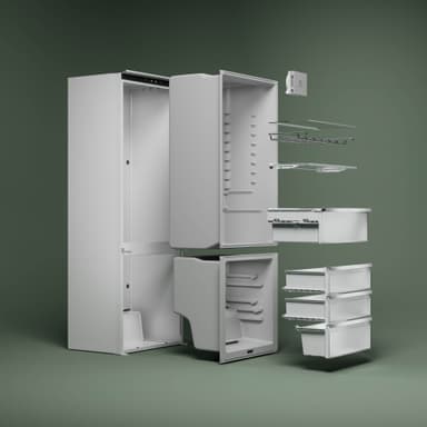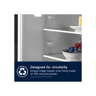 Vi är stolta över att få presentera vår unika kyl-frys med innervägg av 70 % återvunnen plast. Plast från kasserade kylskåp används för att tillverka nya. Det här cirkulära kretsloppet medverkar till reducerat avfall. *Inner liner rHIPS made with up to 70% recycled plastic representing 13% of total fridge plastic"