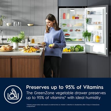 700 GreenZone Kyl-frys har en dedikerad sluten låda med separat klimatfunktion där luftfuktigheten behålls på ideal nivå. Detta bevarar upp till 95 % av vitaminerna efter 11 dagar genom att skydda grönsakerna med den rätta mängden luftfuktighet.*Läs mer om produkten