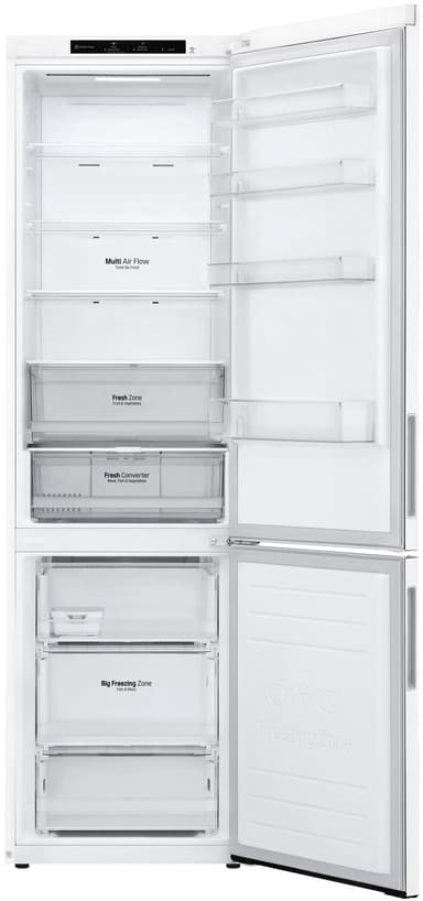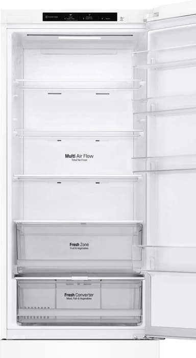 Door Cooling+-funktionen består av ytterligare en Multi Air Flow-kanal som placeras i taket på kyl- och frysdelen. Den blåser ut kall luft vilket leder till en snabbare nedkylning och en jämnare temperatur.* "* Baserat på TÜV Rheinlands testresultat med LG: s interna testmetod som jämför tiden för temperaturen på vattenbehållaren placerad i den övre korgen för att falla mellan DoorCooling + ™ och Non-DoorCooling + ™ -modeller.