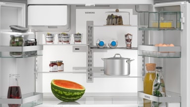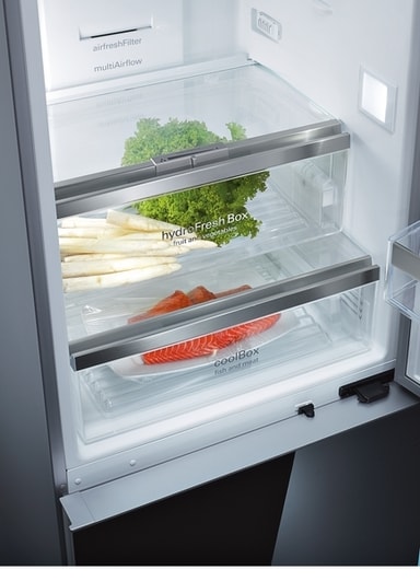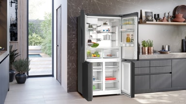 Multi Door kyl- och fryskombination: här möts fräschhållning och intelligent design. Maten hålls färsk längre med hyperFresh XXL <0°C>, ingen avfrostning behövs på grund av noFrost och du får filtrerat vatten och is med en knapptryckning.Läs mer om produkten
