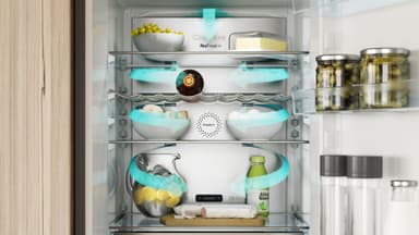 Cool Flow-systemet gör att du kan förvara dina livsmedel på valfri hylla eller låda i kylskåpet och säkerställer att temperaturen snabbt återställs efter att dörren öppnats och stängts. Det kontinuerliga luftflödet minskar också uttorkning och bevarar matens första dagsfärskhet längre.