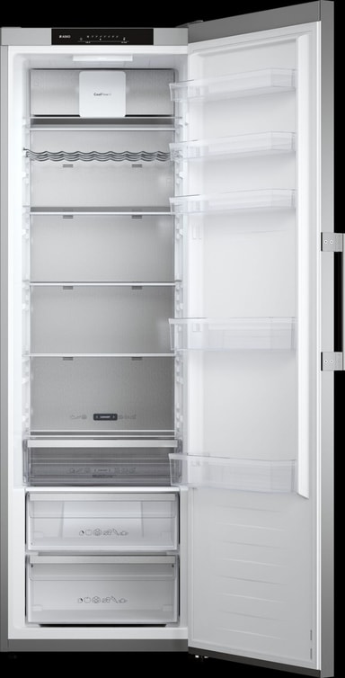 Våra fristående kylskåp har en lättanvänd kontrollpanel med smakfull LED-belysning monterad i innertaket. Detta maximerar kylskåpets innerhöjd, så att du får mer plats för skrymmande varor, samtidigt som det är mer effektivt och ergonomiskt.