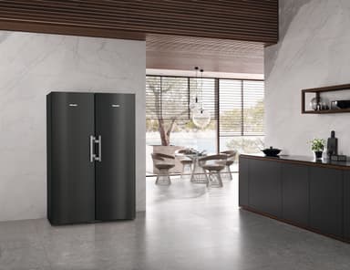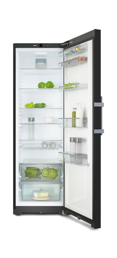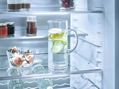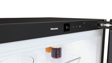 För höga behållare finns det normalt bara plats i kylskåpsdörren. Tack vare den delade glasbotten i Miele FlexiBoard kan dessa behållare nu även förvaras i kyldelen. Skjut den främre delen av FlexiBoard under den bakre. Detta skapar plats för höga flaskor eller mjölkpaket i det främre området. Den bakre delen fungerar fortfarande som förvaringsplats. På detta sätt utnyttjar du allt tillgängligt utrymme optimalt.