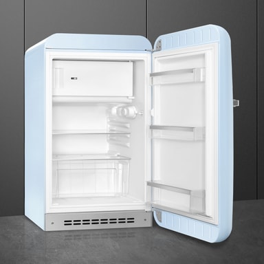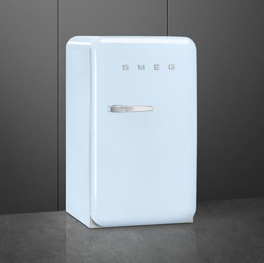 Smeg FAB10RPB6 kylskåp, 105L, pastellblå i 50-talsstil, inkluderar 2 justerbara hyllor, grönsakslåda och LED-ljus. Tyst drift på 35 dB med högerhängd dörr, idealisk för stiliga, små utrymmen.Läs mer om produkten