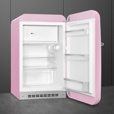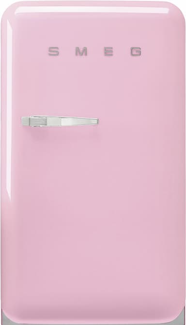 Smeg FAB10RPK6 Kylskåp: Ett stilfullt 105L rosa retrokylskåp med tyst drift på 35dB, utrustat med 2 justerbara hyllor, 1 grönsakslåda, LED-belysning och en högerhängd dörr för kompakt, chic kökselegans.Läs mer om produkten