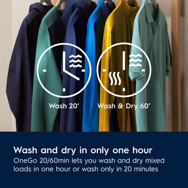 Med OneGo 20/60min kan du tvätta och torka mindre, blandade tvättar på en timme – eller bara tvätta på 20 minuter. Få snabb, praktisk klädvård när du har bråttom.