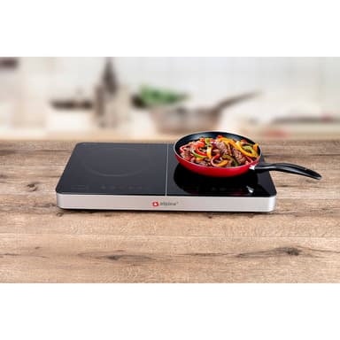 En mycket elegant dubbel induktionshäll med digital effekt, temperatur och timerinställning via beröringskänsliga kontroller.