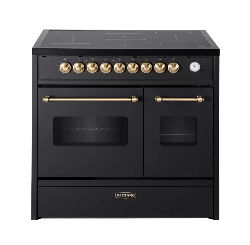 Pazzano - Cuore - Induktionsspis 90 cm (2 ugnar) (Svart/Borstad mässing)Serien Cuore från Pazzano är framtagen för dig som söker en spis med karaktär, där inslag från italiensk spisdesign kombineras med hög prestanda och genomtänkta funktioner.Läs mer om produkten