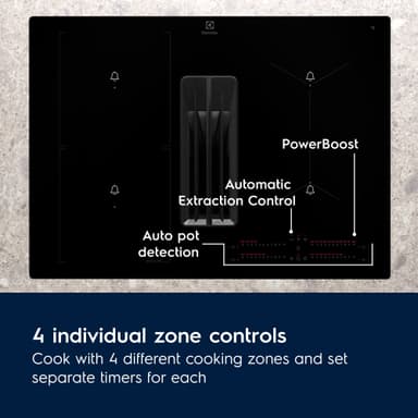 4 individuella zonkontroller låter dig kontrollera 4 olika kokzoner och ställa in separata timers för var och en av dem. Varje zon har 9 effektnivåer, PowerBoost, active touch, barnlås och automatisk fläktkontroll.