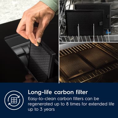 Kolfilter med lång livslängd är lätt att rengöra och ta bort och håller köksluften fräsch. Rengör det bara med diskvatten och regenerera det för att utöka filterlivslängden med upp till åtta gånger.
