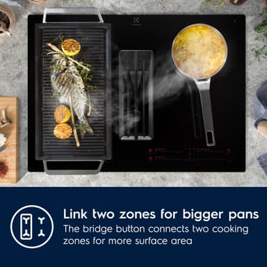 Njut av flera fördelar med en induktionshäll som passar in i ett 60 cm skåp med en inbyggd fläkt för optimalt luftflöde. 600 Bridge induktionshäll med inbyggd fläkt har även en Bridge-funktion som låter dig kombinera två kokzoner till ett större område.