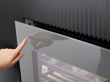 Miele underbyggnads-vinkyl med Push2Open öppnar sig till synes själva. Genom att trycka lätt på glasdörren aktiveras öppningsautomatiken. Dörren öppnas mjukt så att du bekvämt kan gripa in bakom den och öppna den helt. Miele vinskåp med Push2open behöver inget handtag och kan därför integreras optimalt och i liv med alla köks- och bostadsmiljöer.